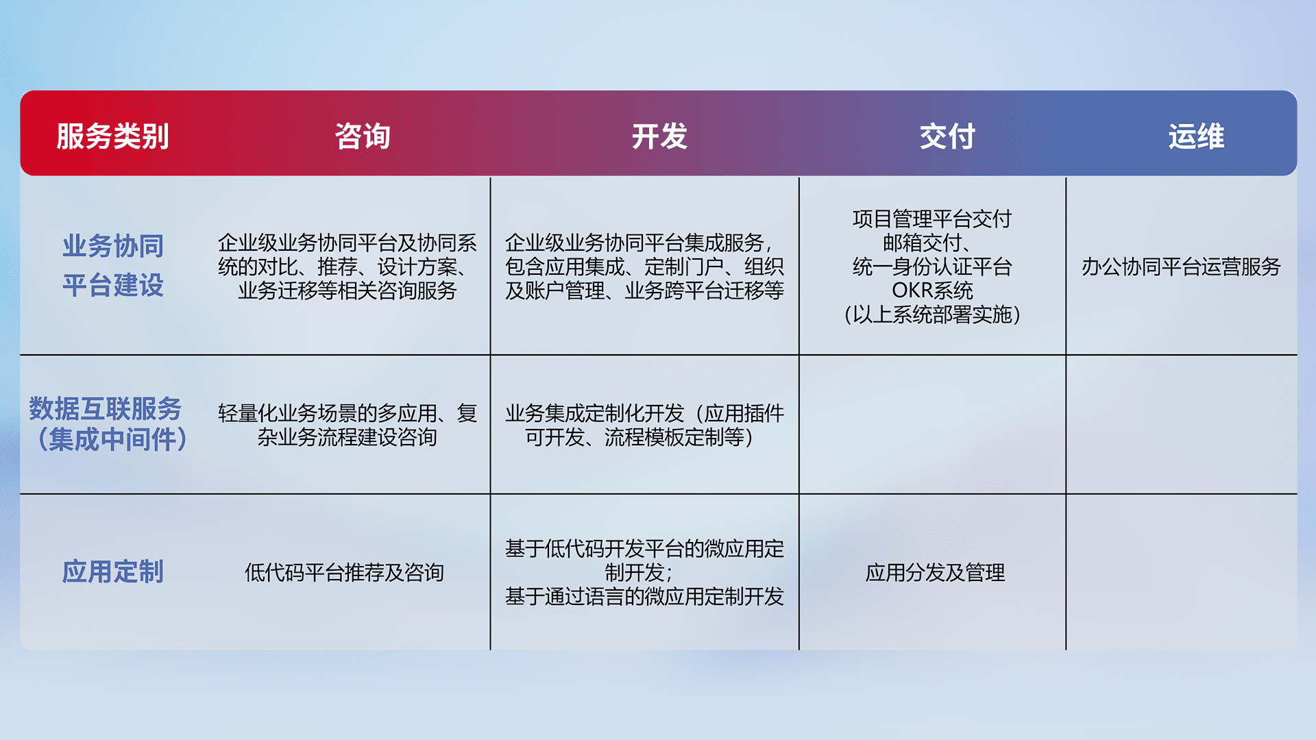 针对钉钉、、企微、、、、IDaas等平台级产品提供产品的规划、、、方案、、交付、、、定制化开发等服务,,实现如统一协同办公、、智能客户服务、、、、混合会议管理、、、、智能数据查询、、等业务场景,,,,实现数字化转型。。
